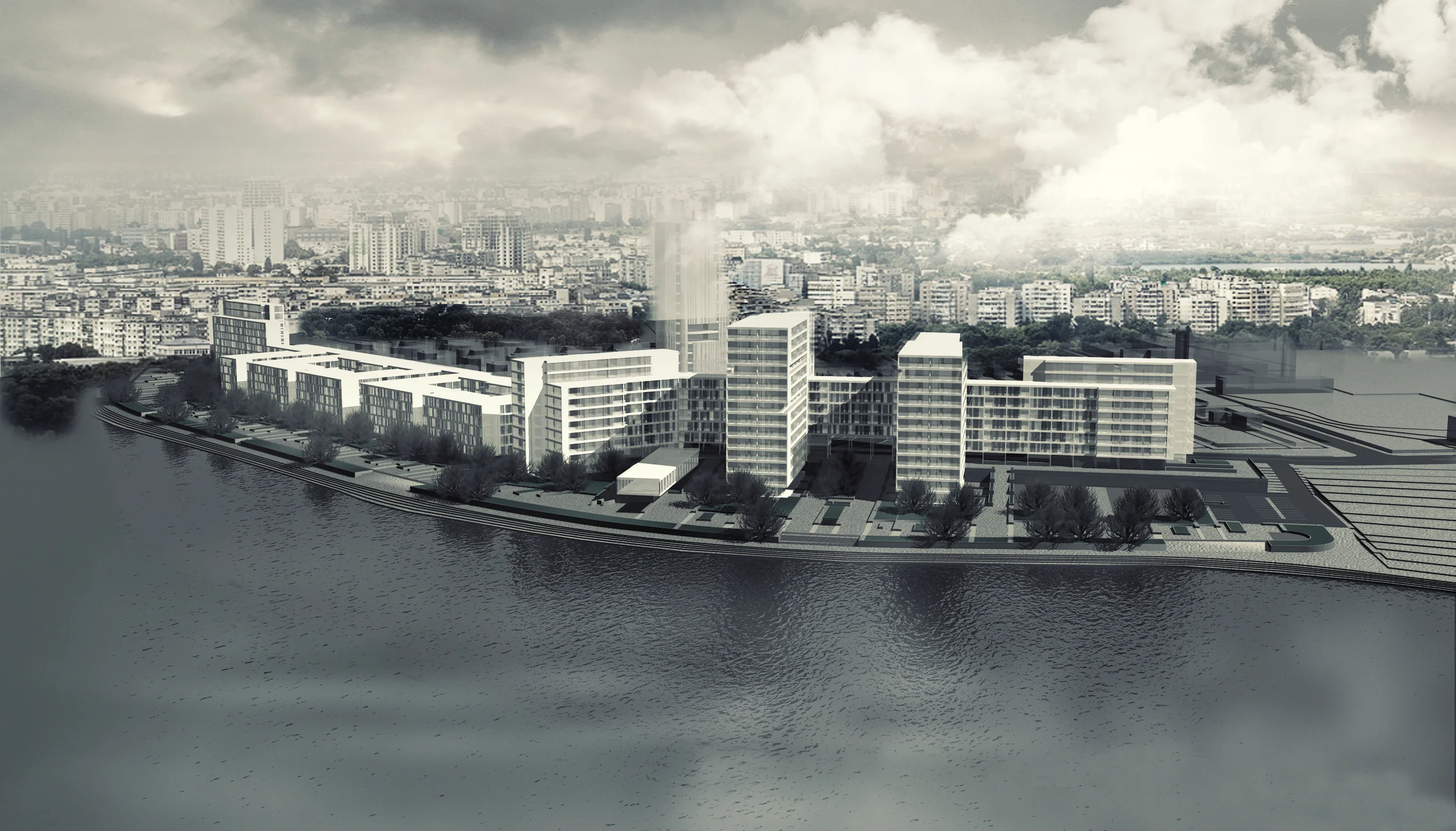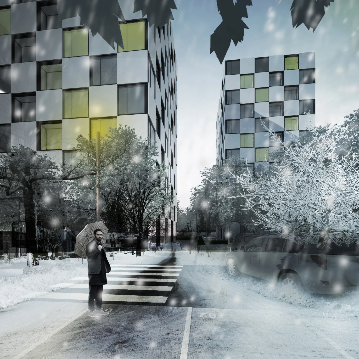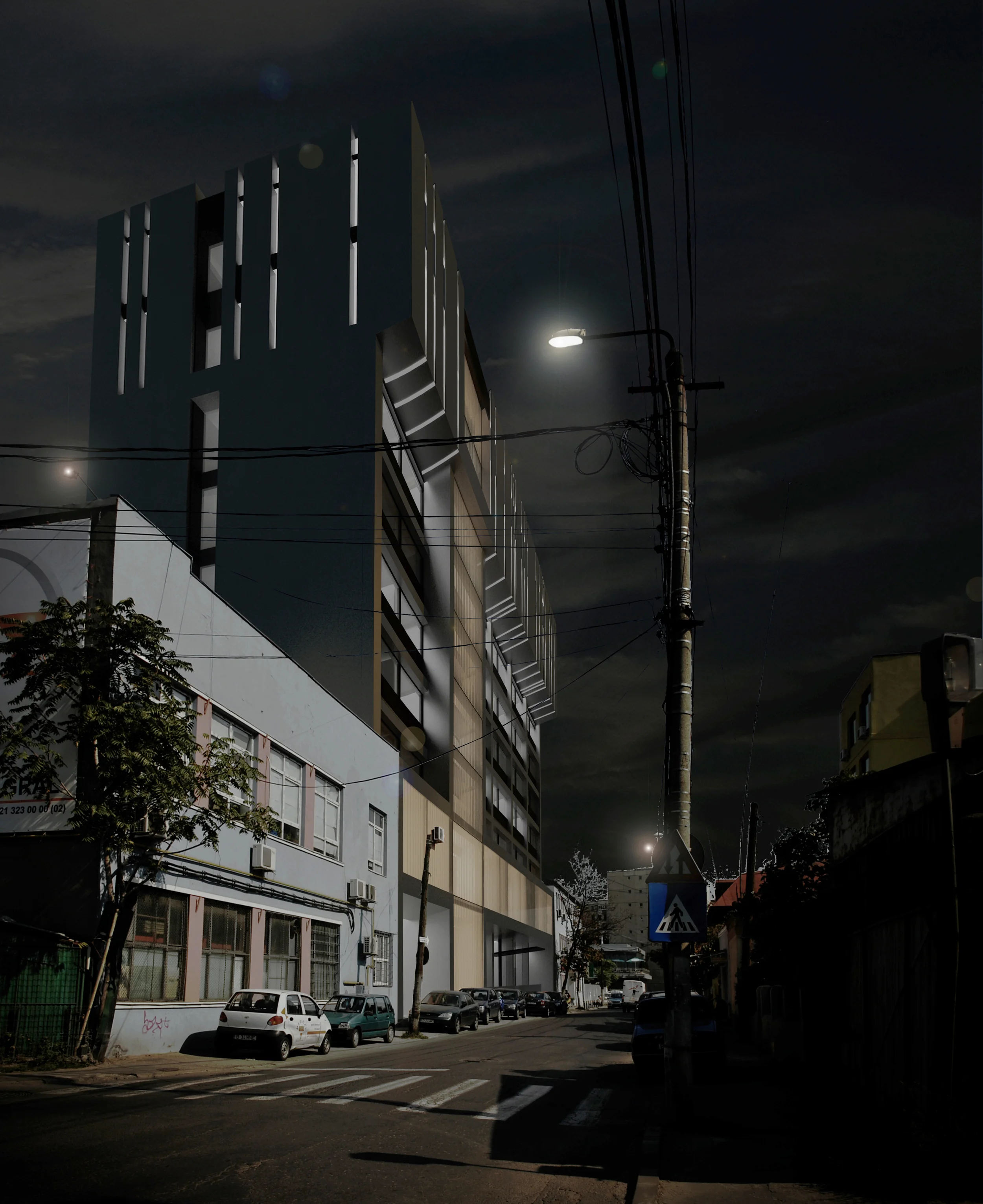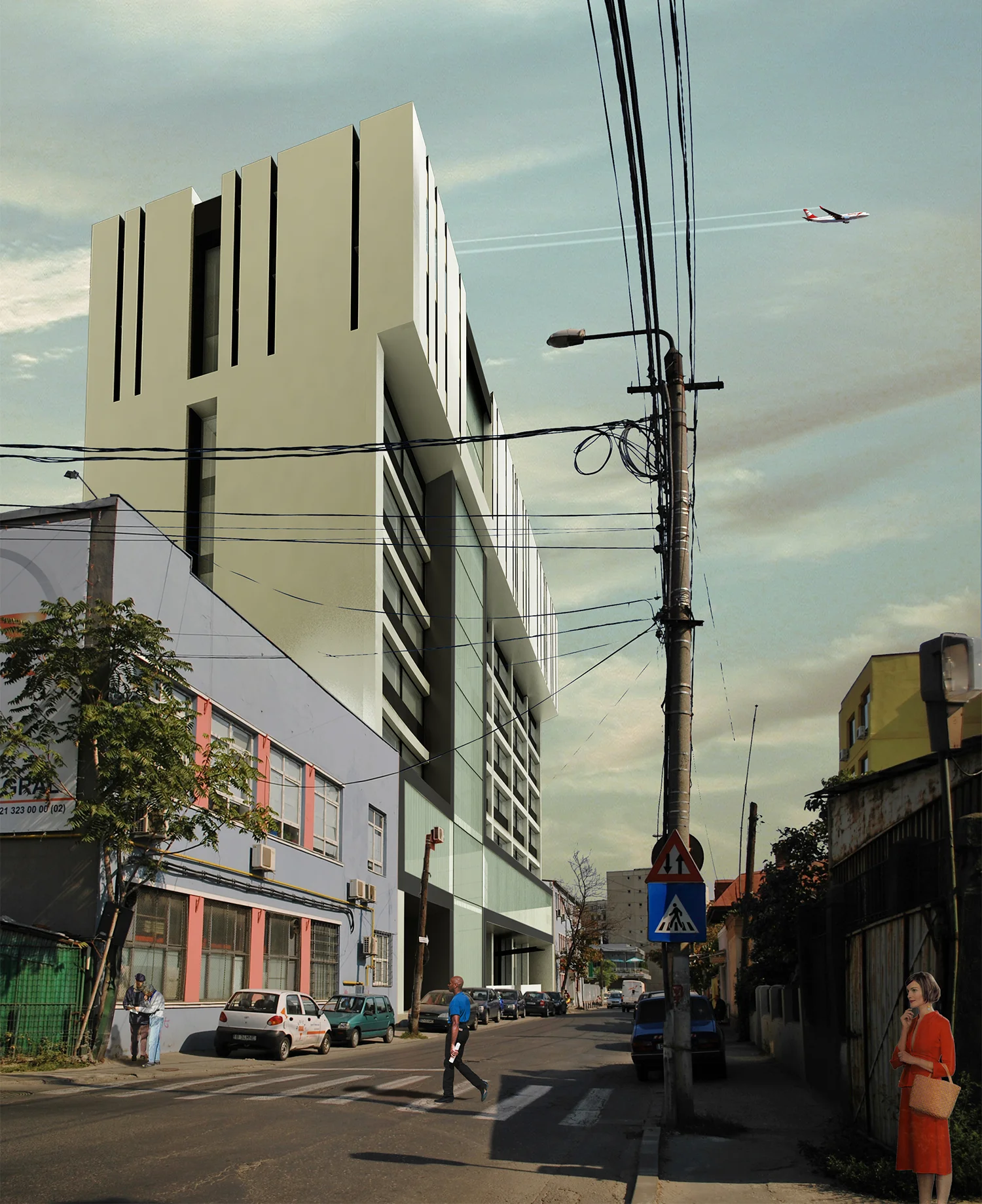 The first challenge of the project was to use a typology used by the modernist architecture (largely implemented during the communist years in Romania) and to reinvent it. Therefore we adopted the slab - the abstract prism - as the main volume to be used in the new development. What used to be a simple abstract box with small openings became a multilayered facade with large windows and loggias. Different materials describe distinct patterns on the facade generating diversity, reintroducing the concept of ornament as abstract composition of vertical and horizontal surfaces.