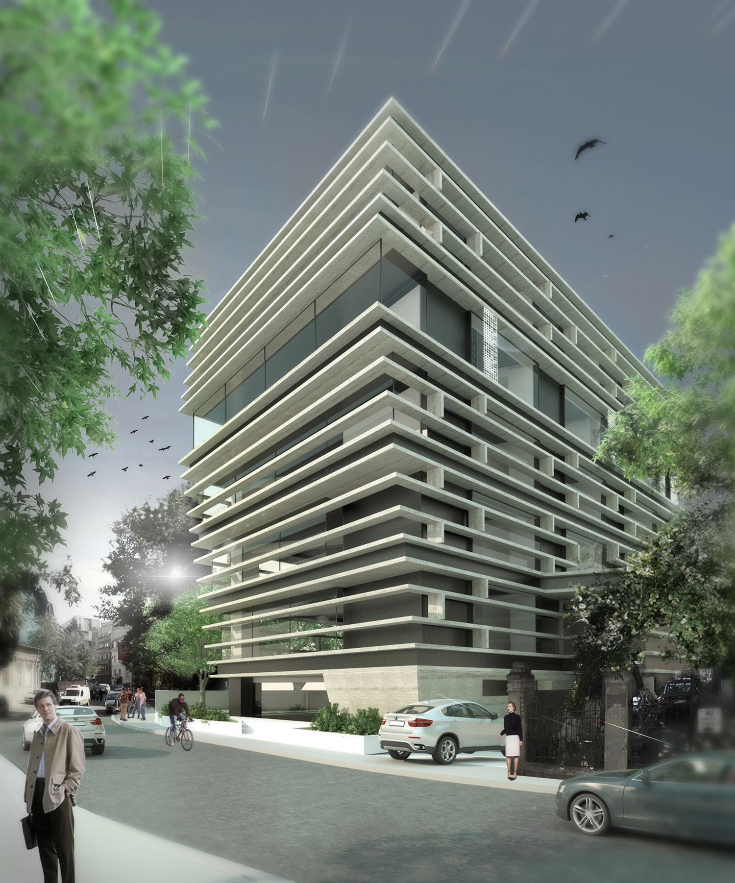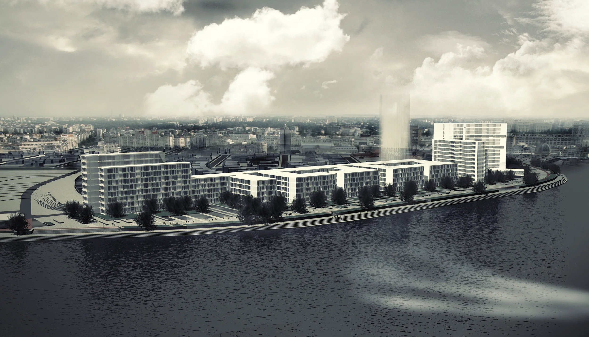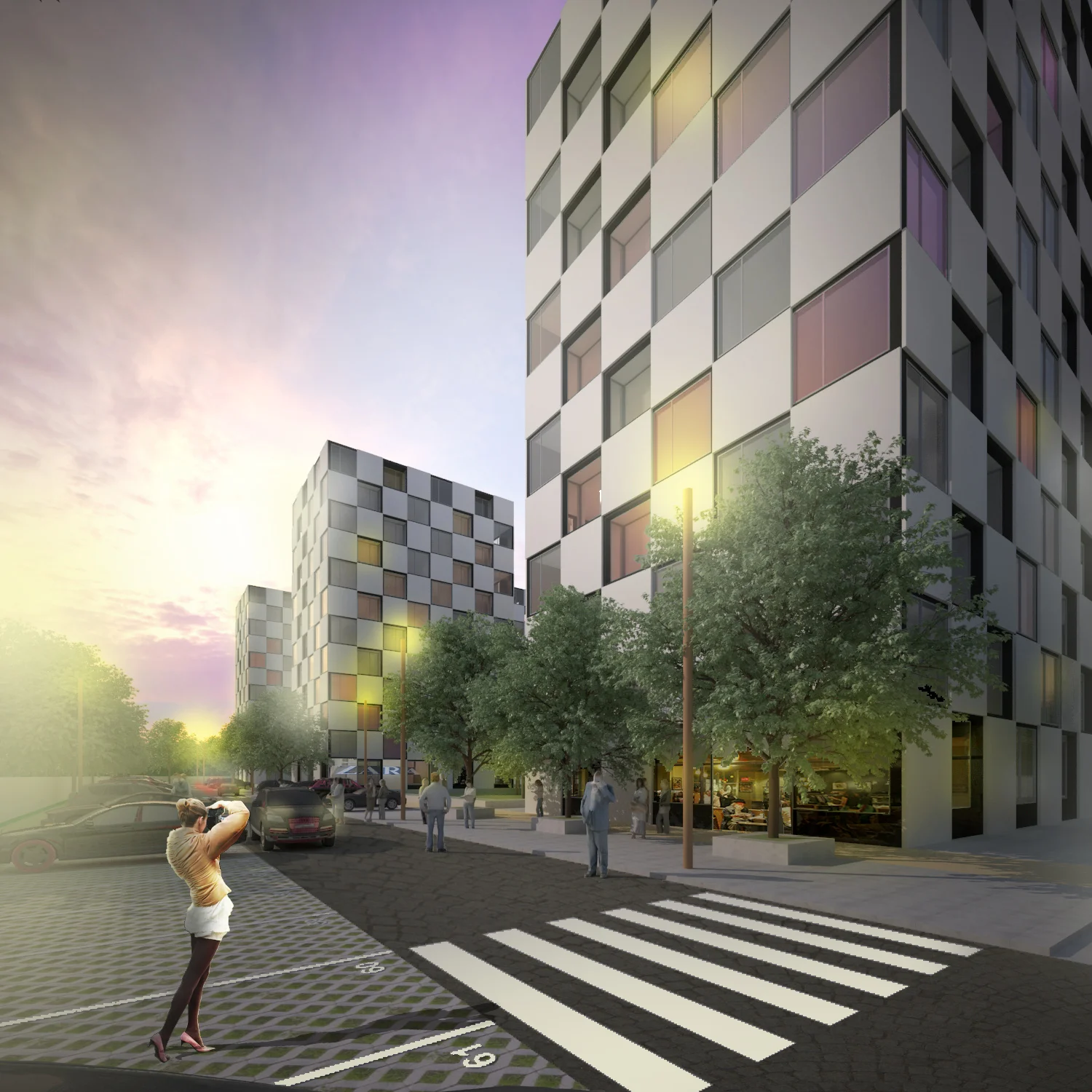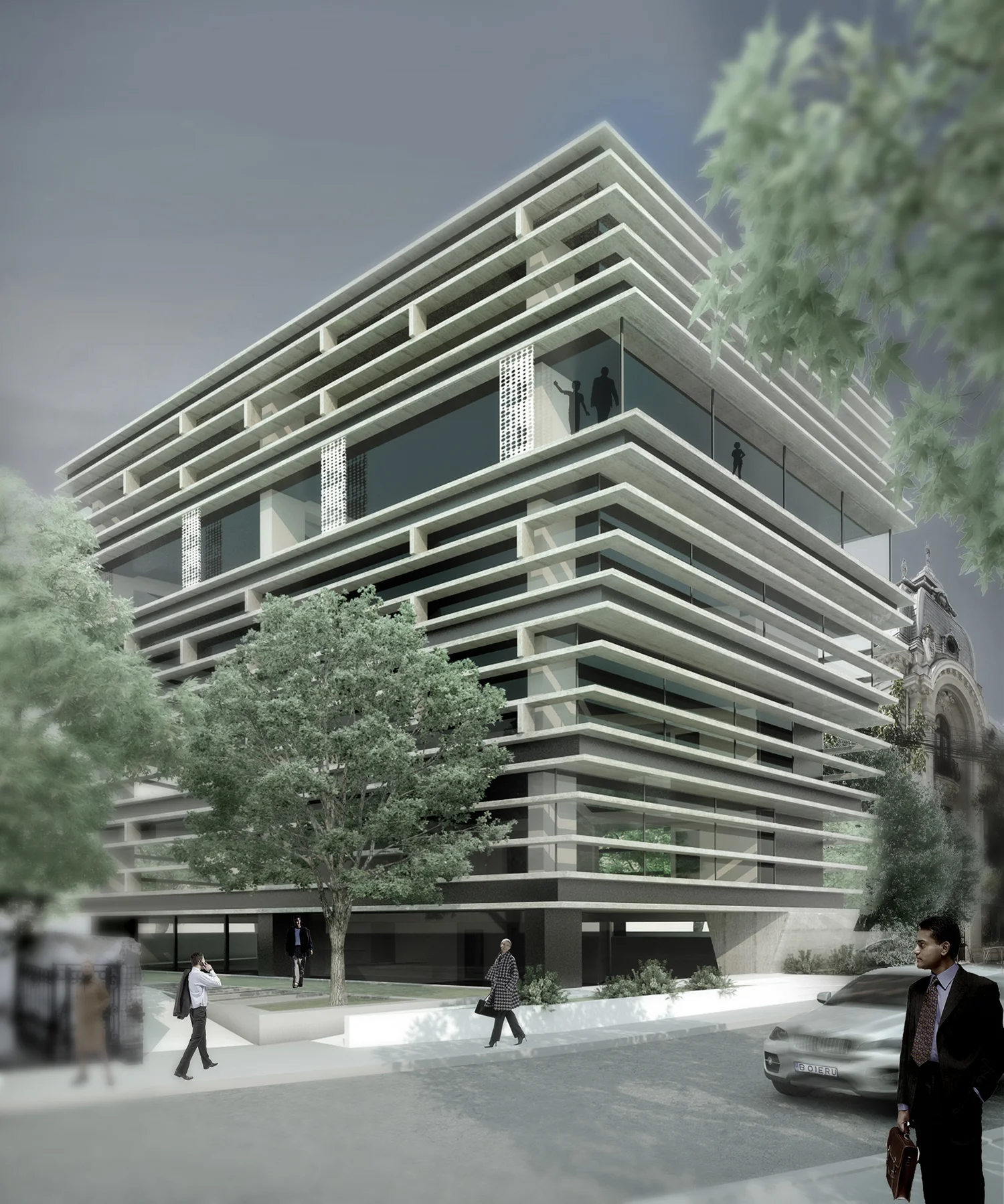 The first challenge of the project was to use a typology used by the modernist architecture (largely implemented during the communist years in Romania) and to reinvent it. Therefore we adopted the slab - the abstract prism - as the main volume to be used in the new development. What used to be a simple abstract box with small openings became a multilayered facade with large windows and loggias. Different materials describe distinct patterns on the facade generating diversity, reintroducing the concept of ornament as abstract composition of vertical and horizontal surfaces.