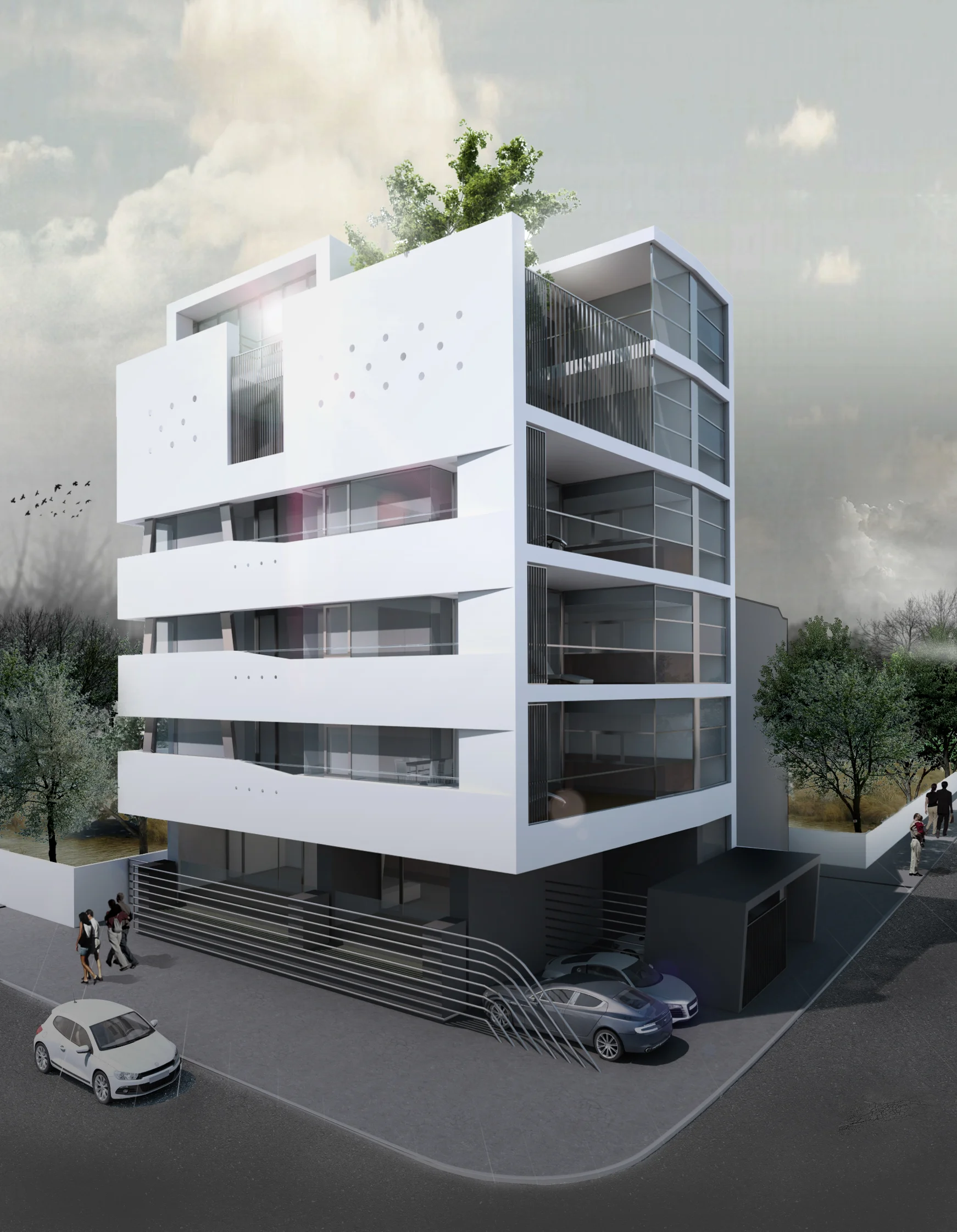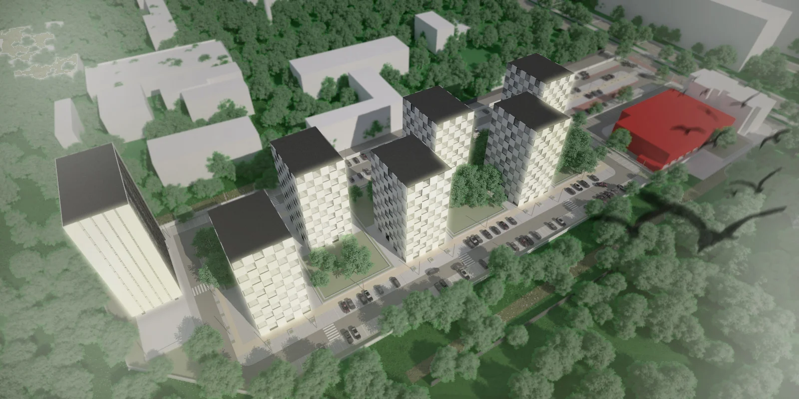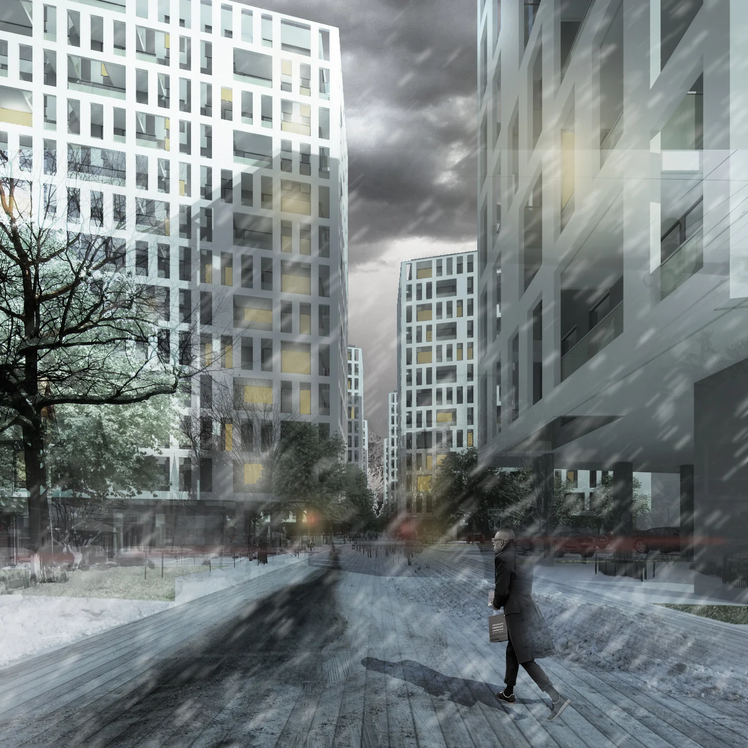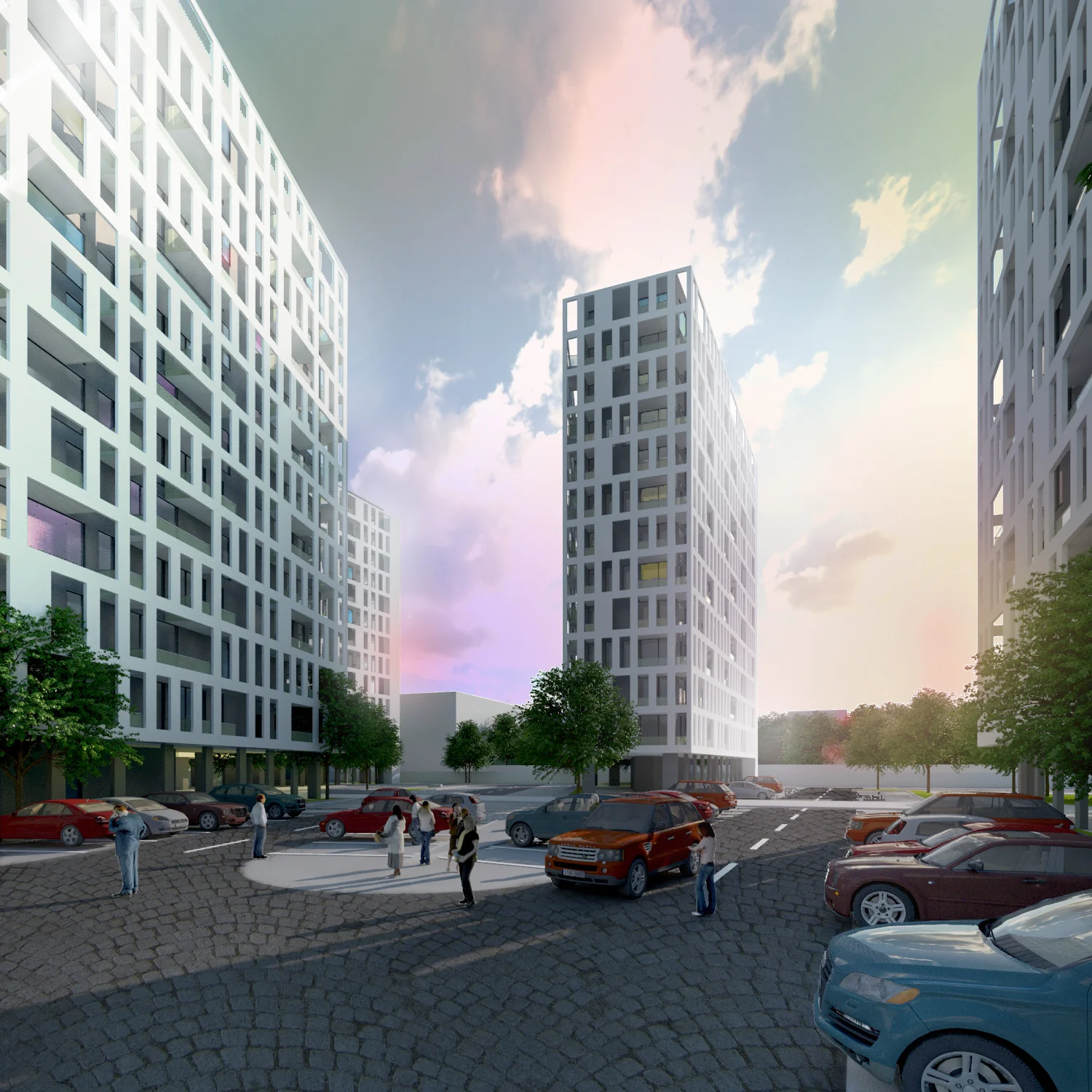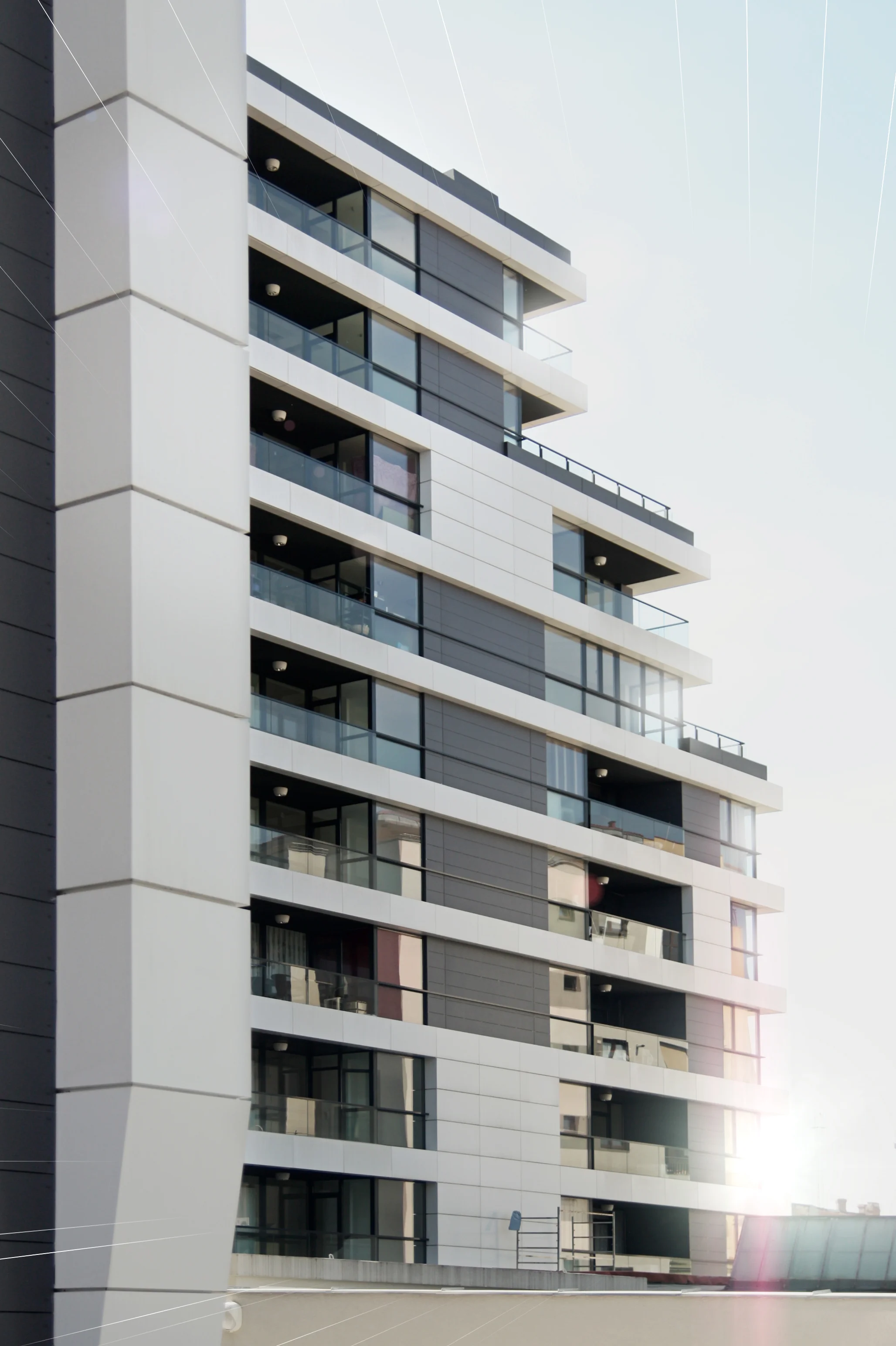 The first challenge of the project was to use a typology used by the modernist architecture (largely implemented during the communist years in Romania) and to reinvent it. Therefore we adopted the slab - the abstract prism - as the main volume to be used in the new development. What used to be a simple abstract box with small openings became a multilayered facade with large windows and loggias. Different materials describe distinct patterns on the facade generating diversity, reintroducing the concept of ornament as abstract composition of vertical and horizontal surfaces.