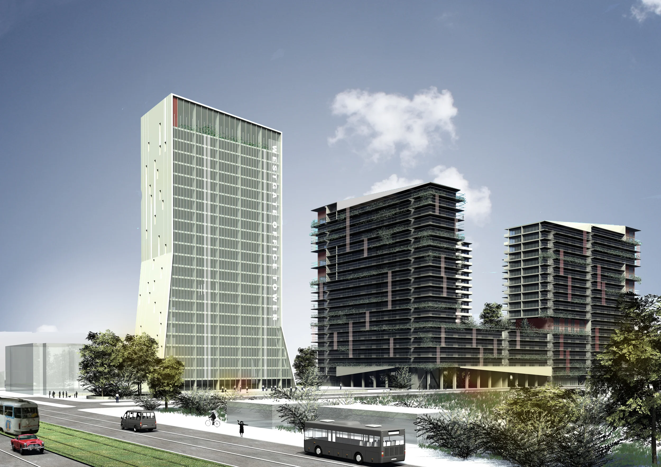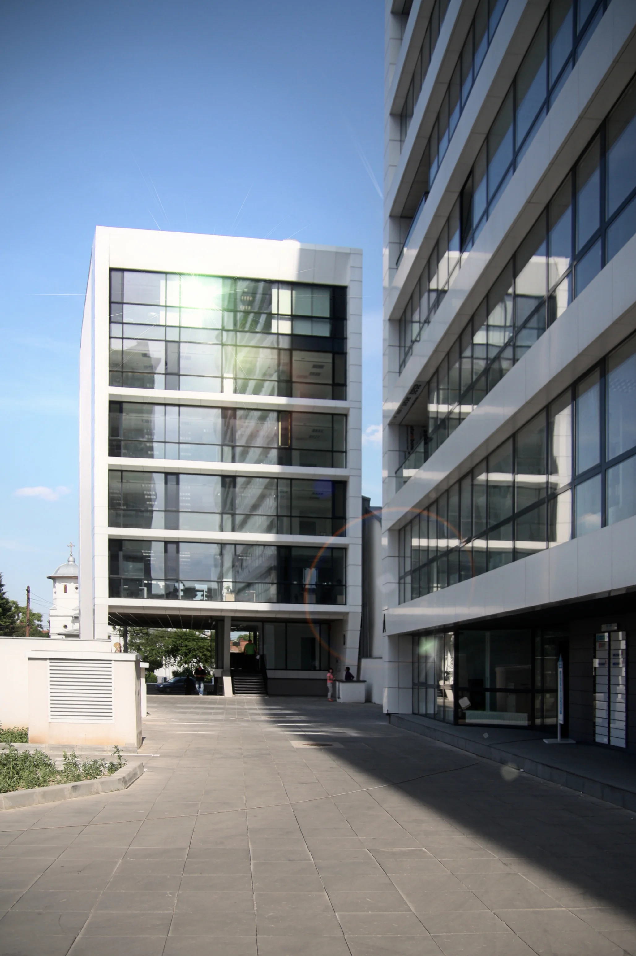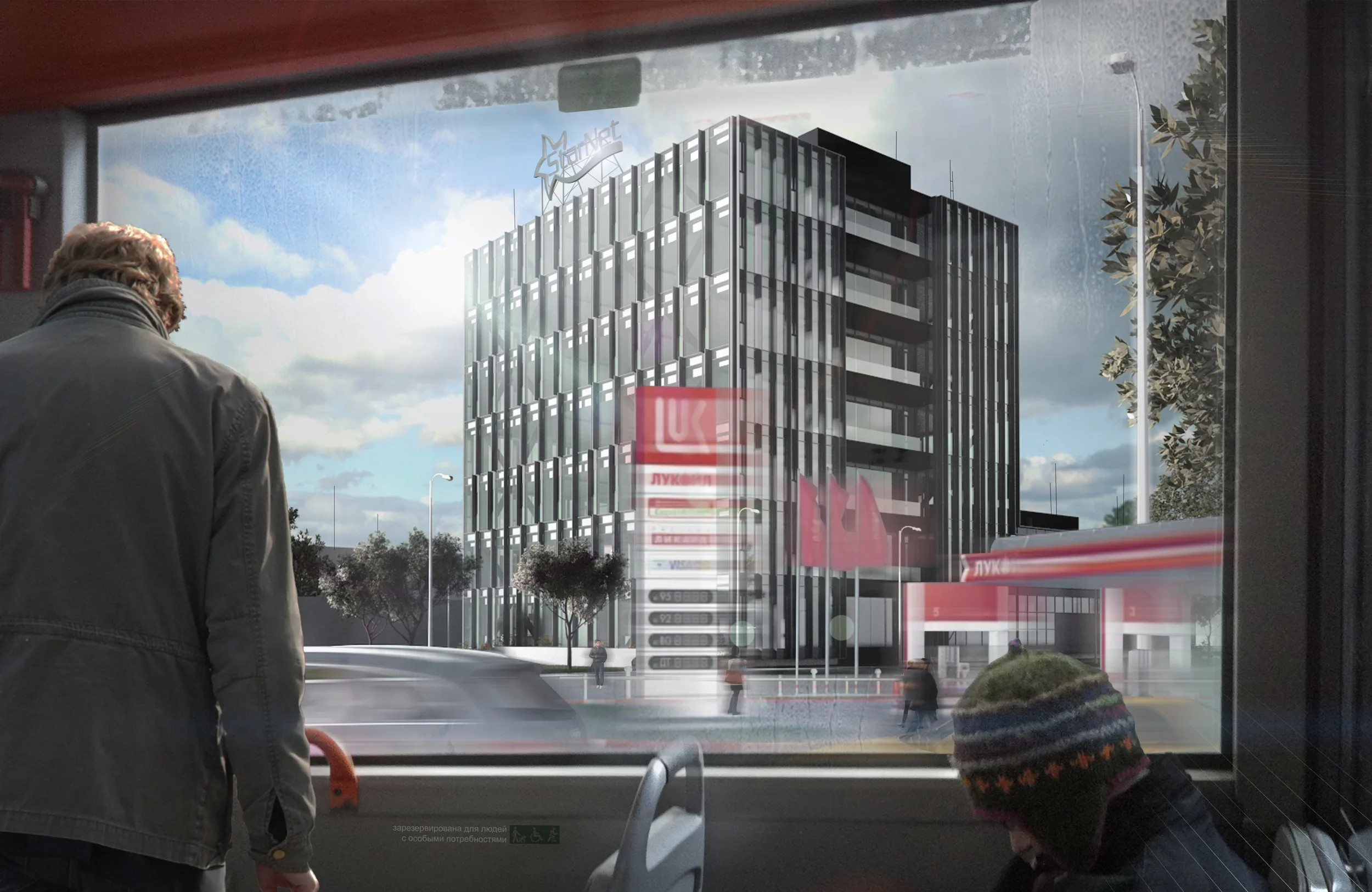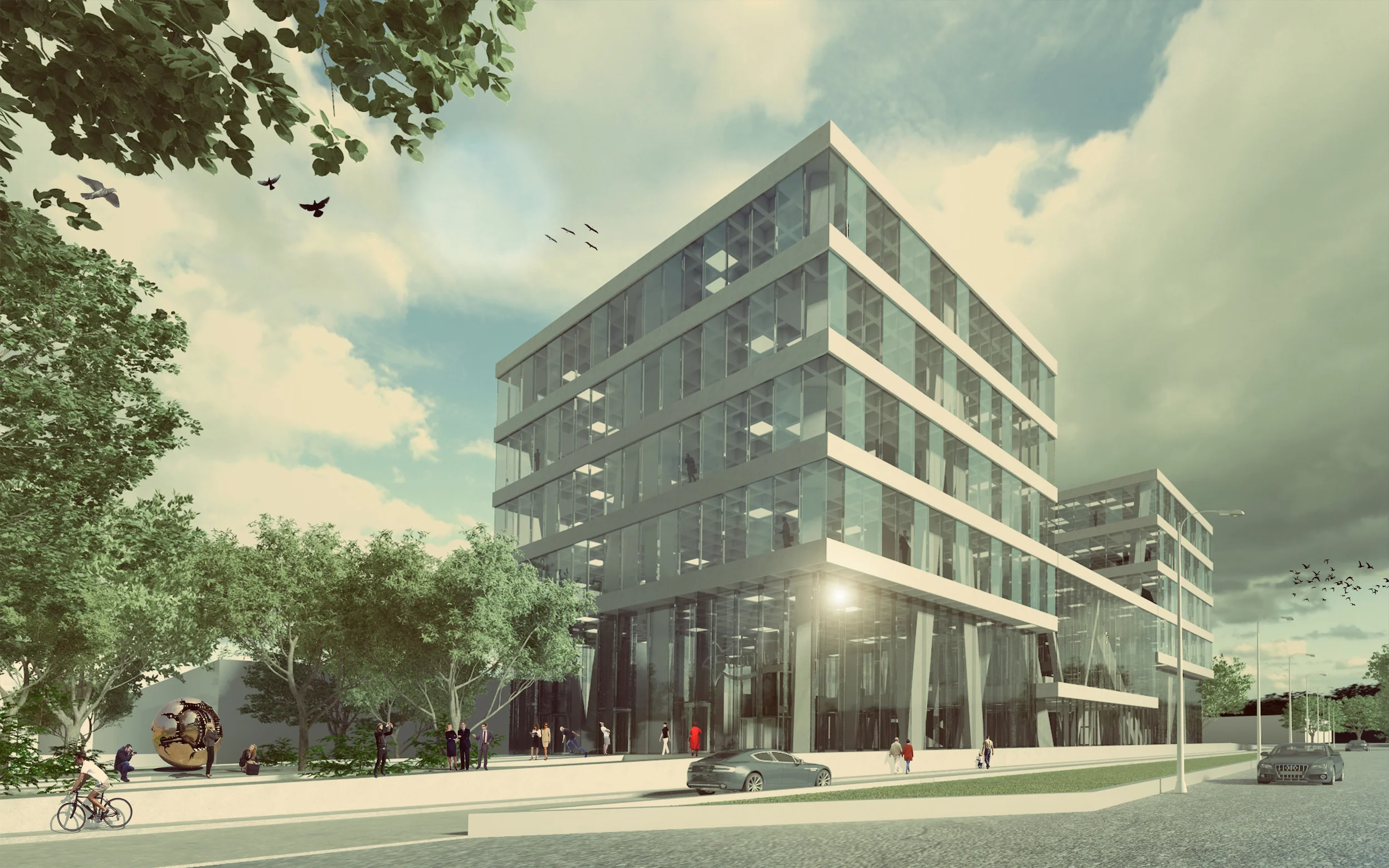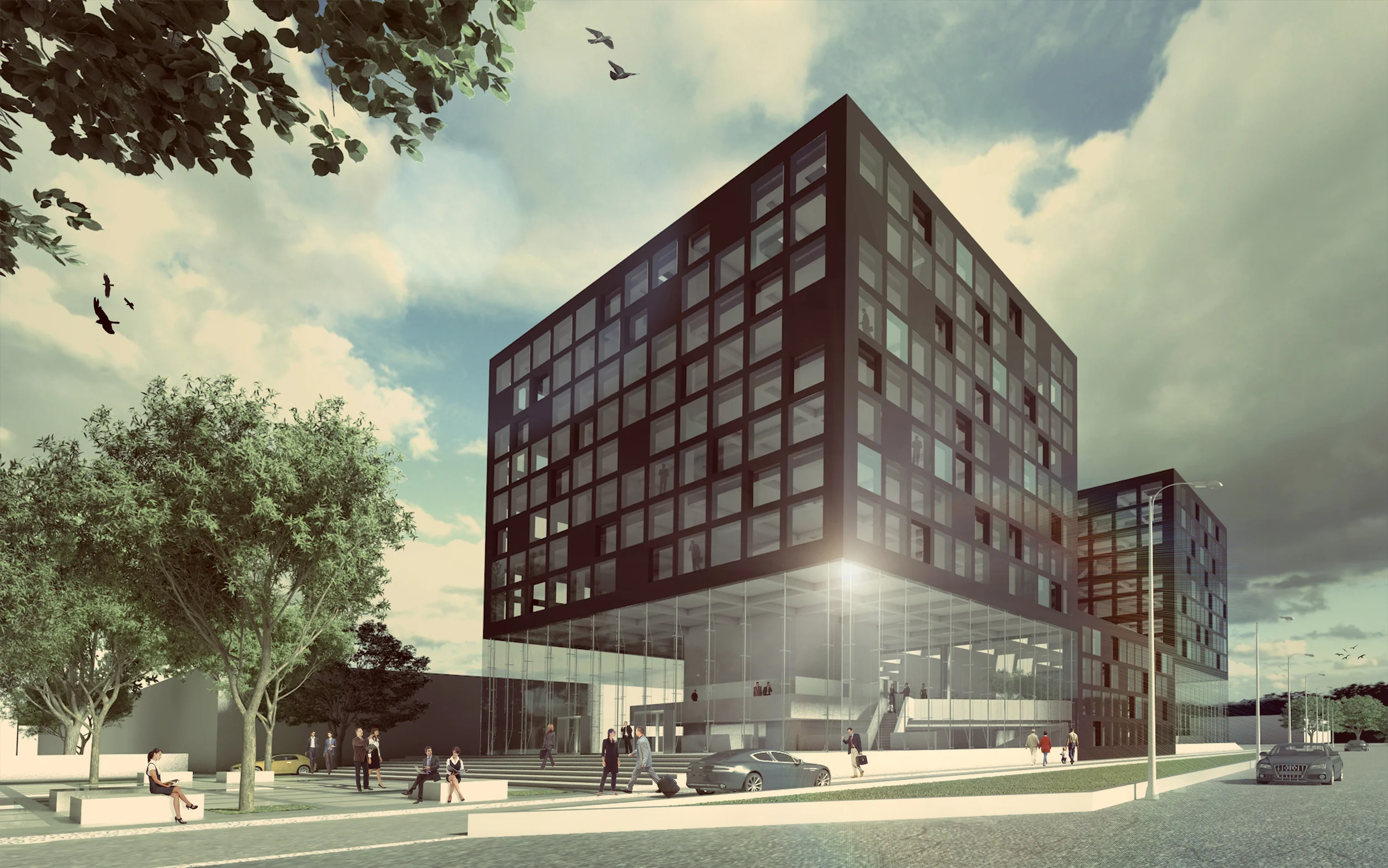 The program of block 1 is offices and its volume is a pure prism - the main compositional element is the horizontal stripes of windows which are a quote of modernist principles. The lateral facades are almost blind with small openings and hanging balconies for smokers, which allow panoramic views.