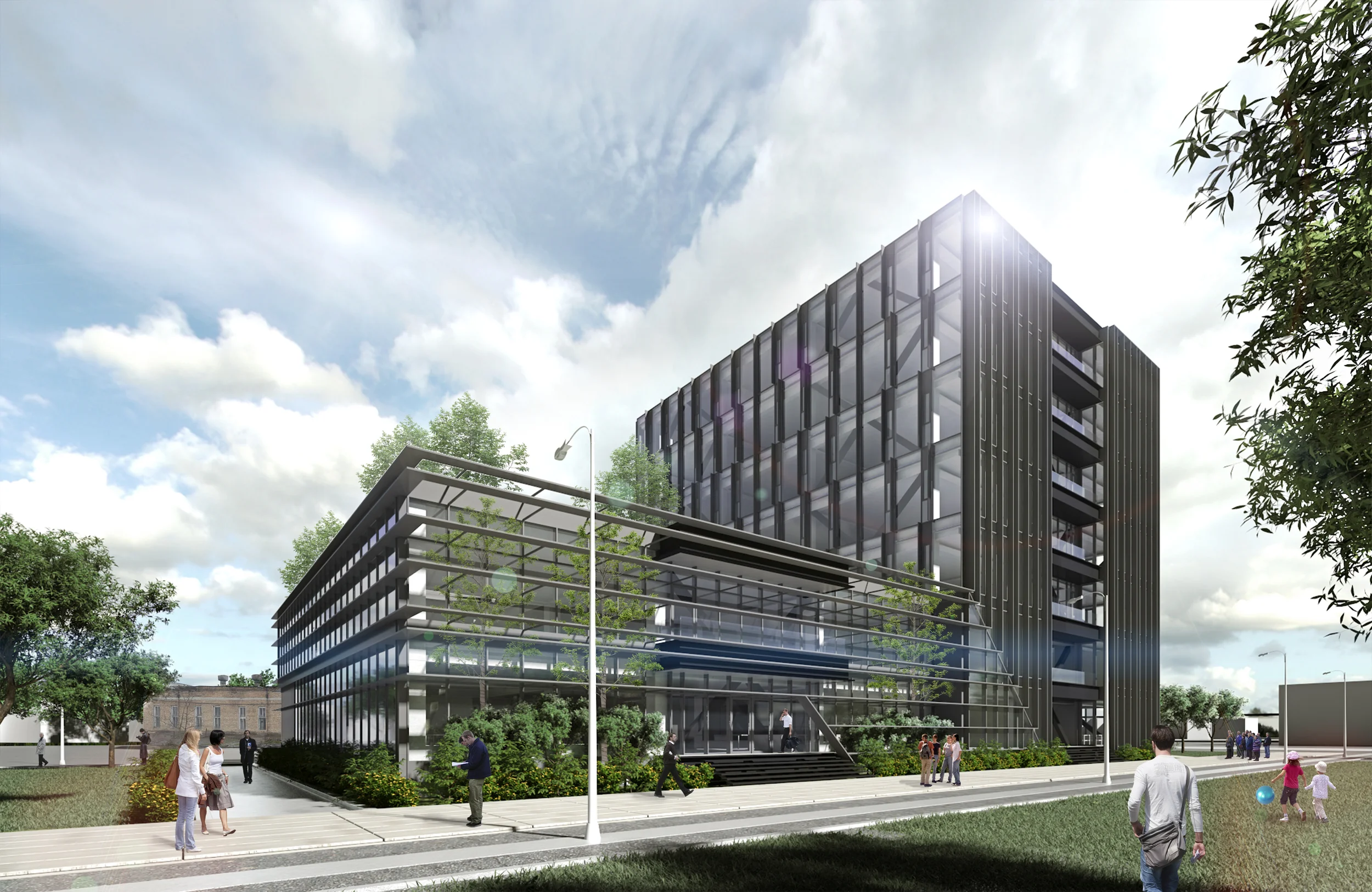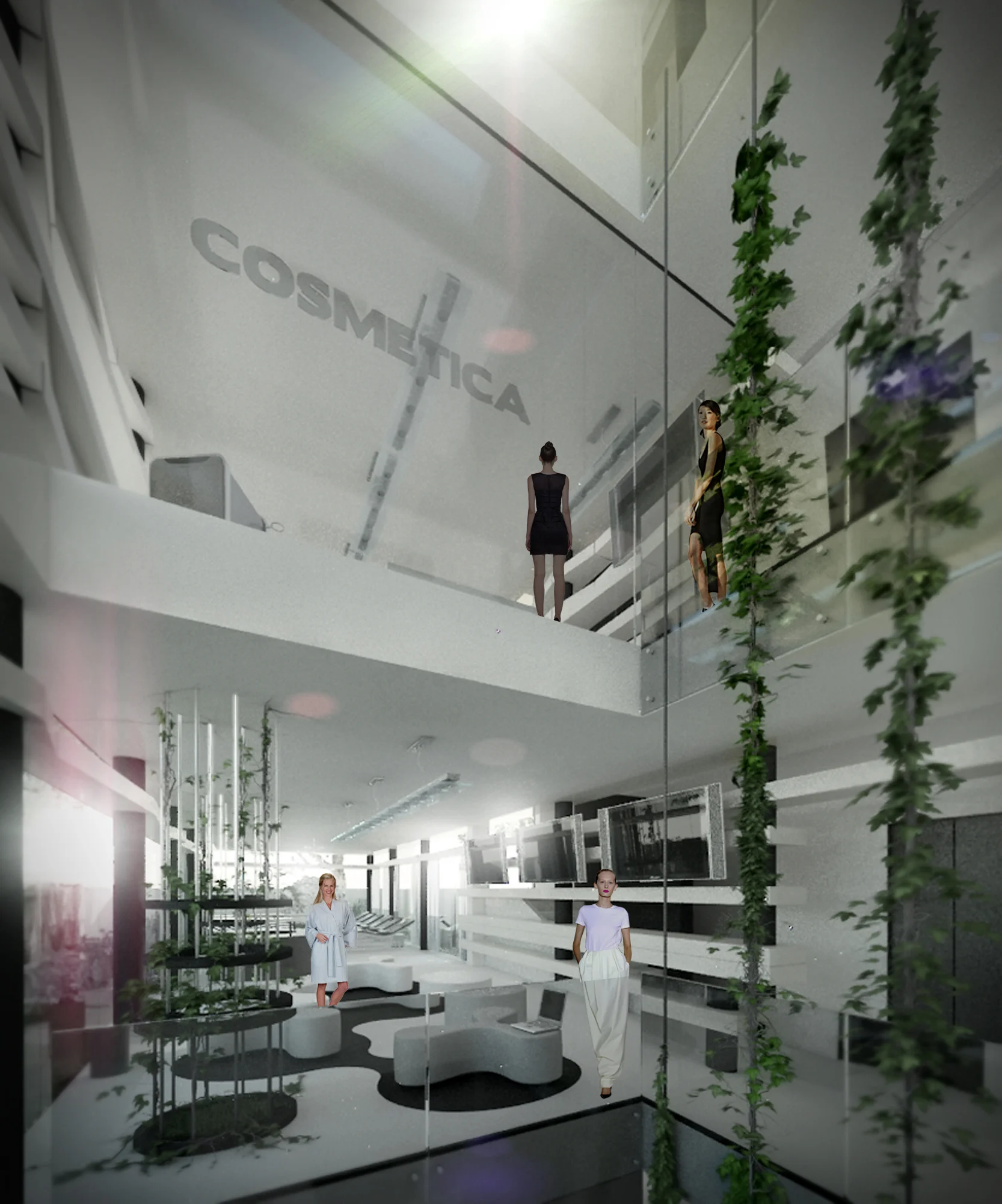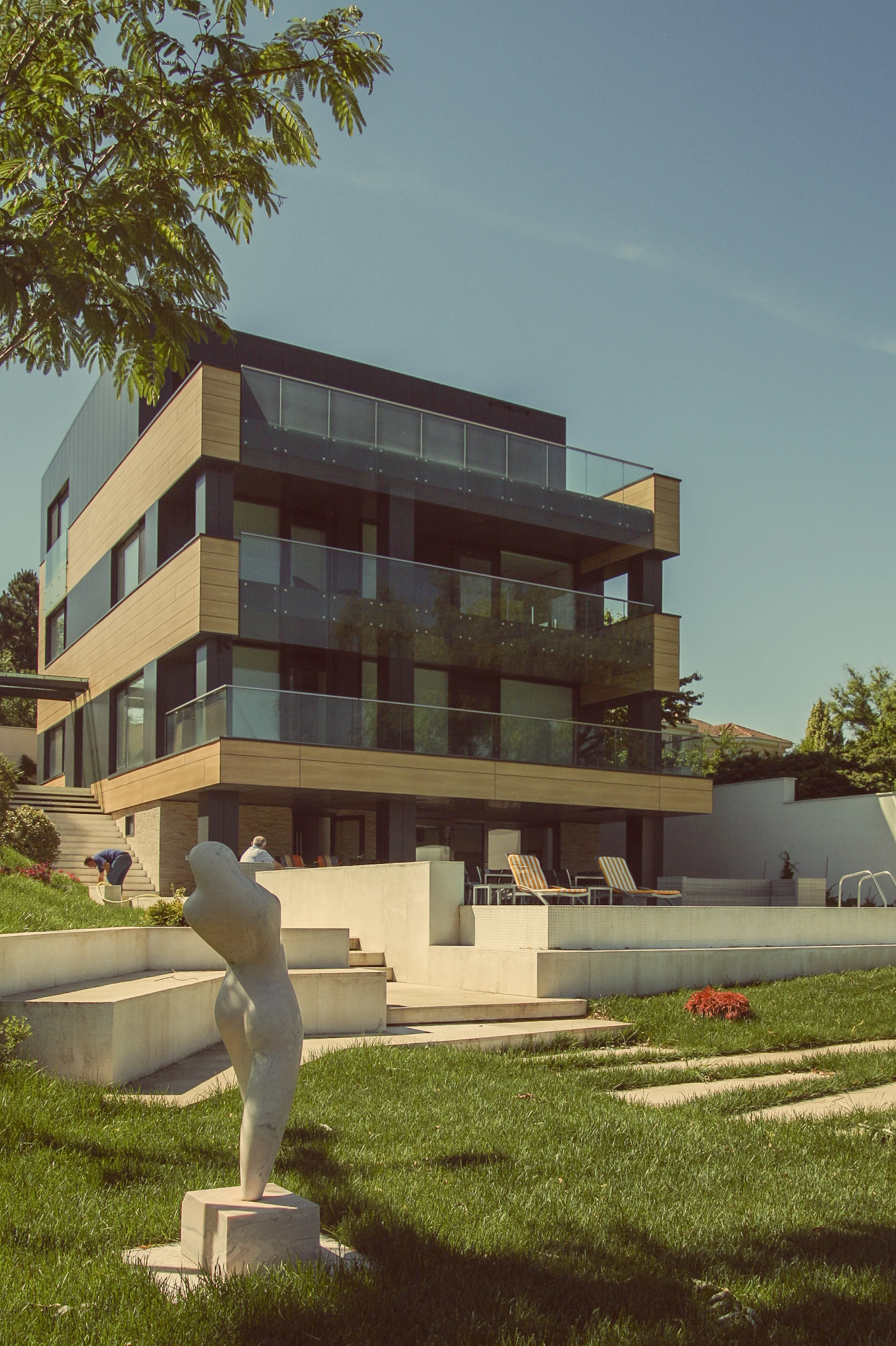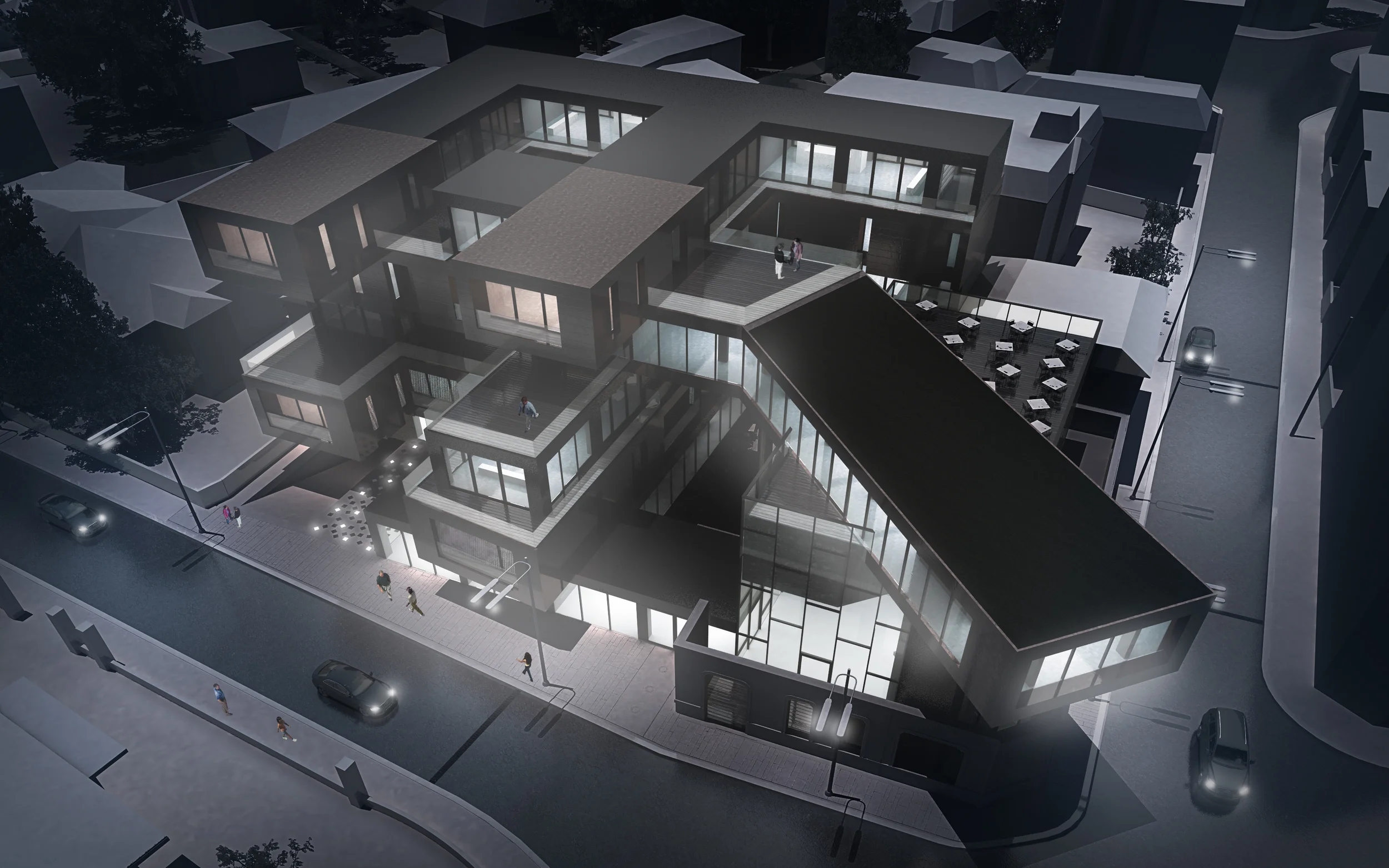 The program of block 1 is offices and its volume is a pure prism - the main compositional element is the horizontal stripes of windows which are a quote of modernist principles. The lateral facades are almost blind with small openings and hanging balconies for smokers, which allow panoramic views.