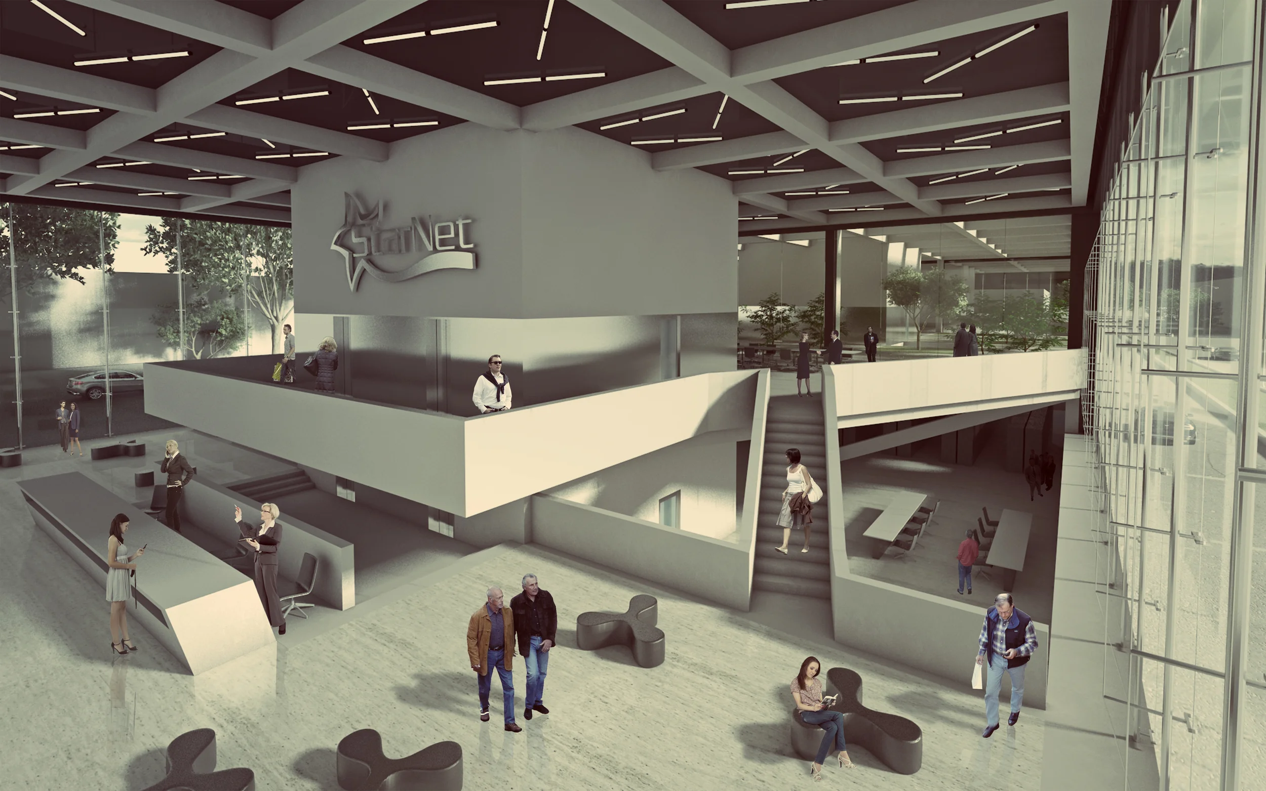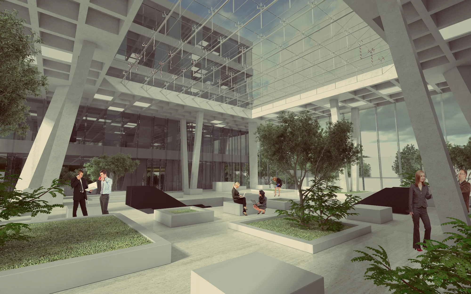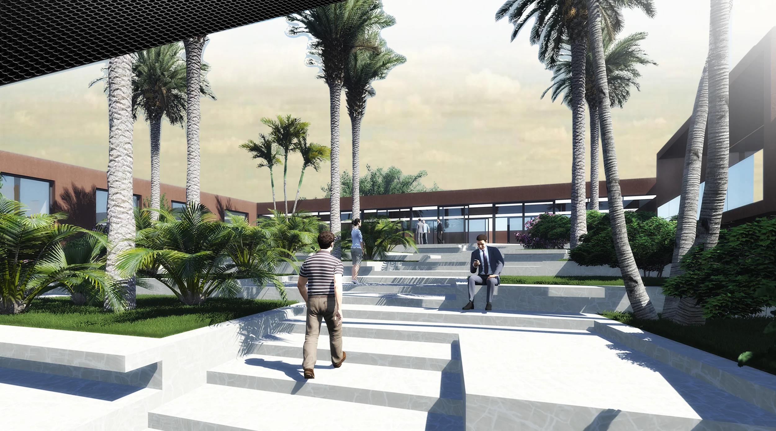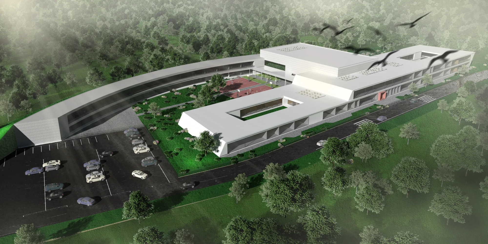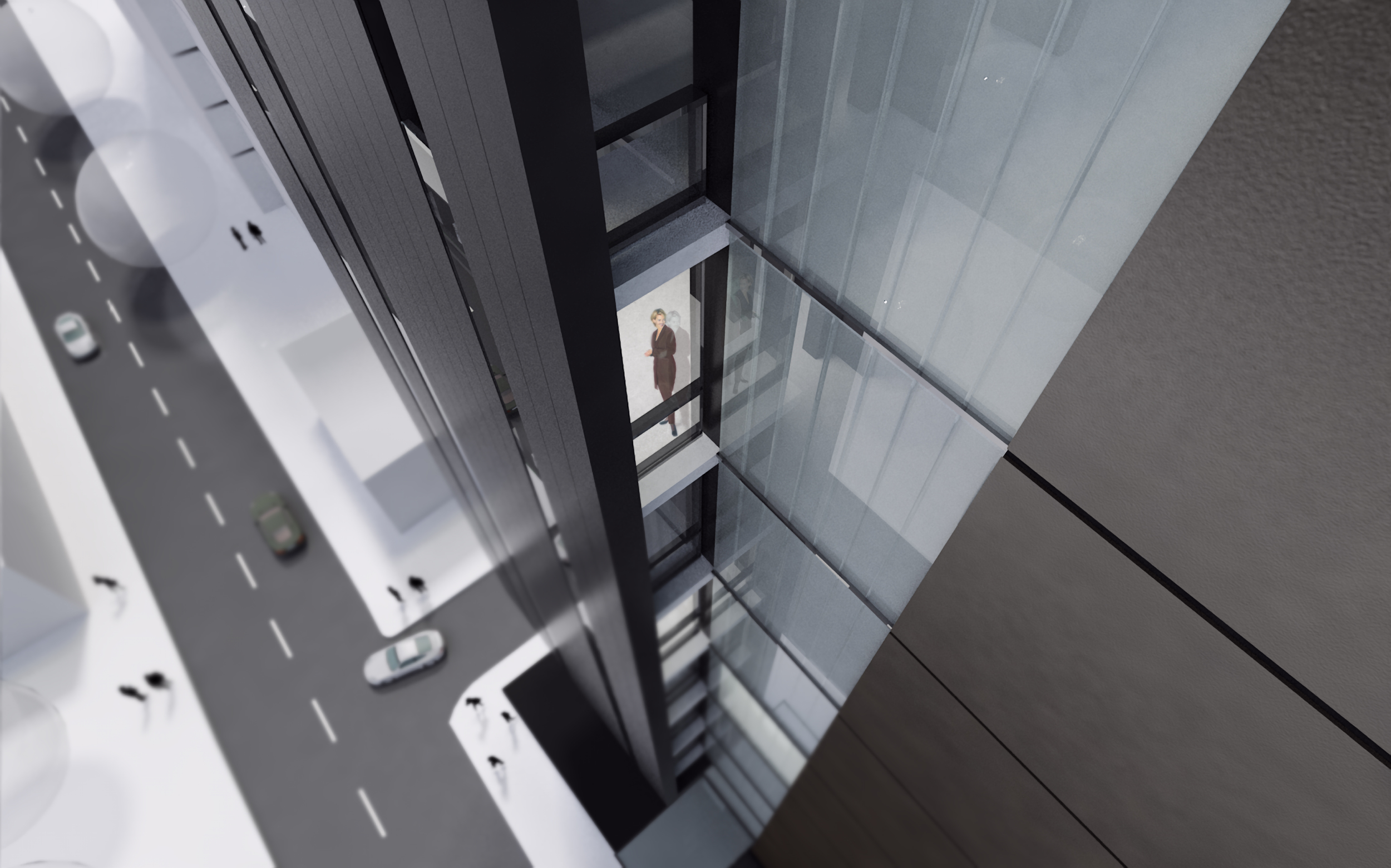 The program of block 1 is offices and its volume is a pure prism - the main compositional element is the horizontal stripes of windows which are a quote of modernist principles. The lateral facades are almost blind with small openings and hanging balconies for smokers, which allow panoramic views.