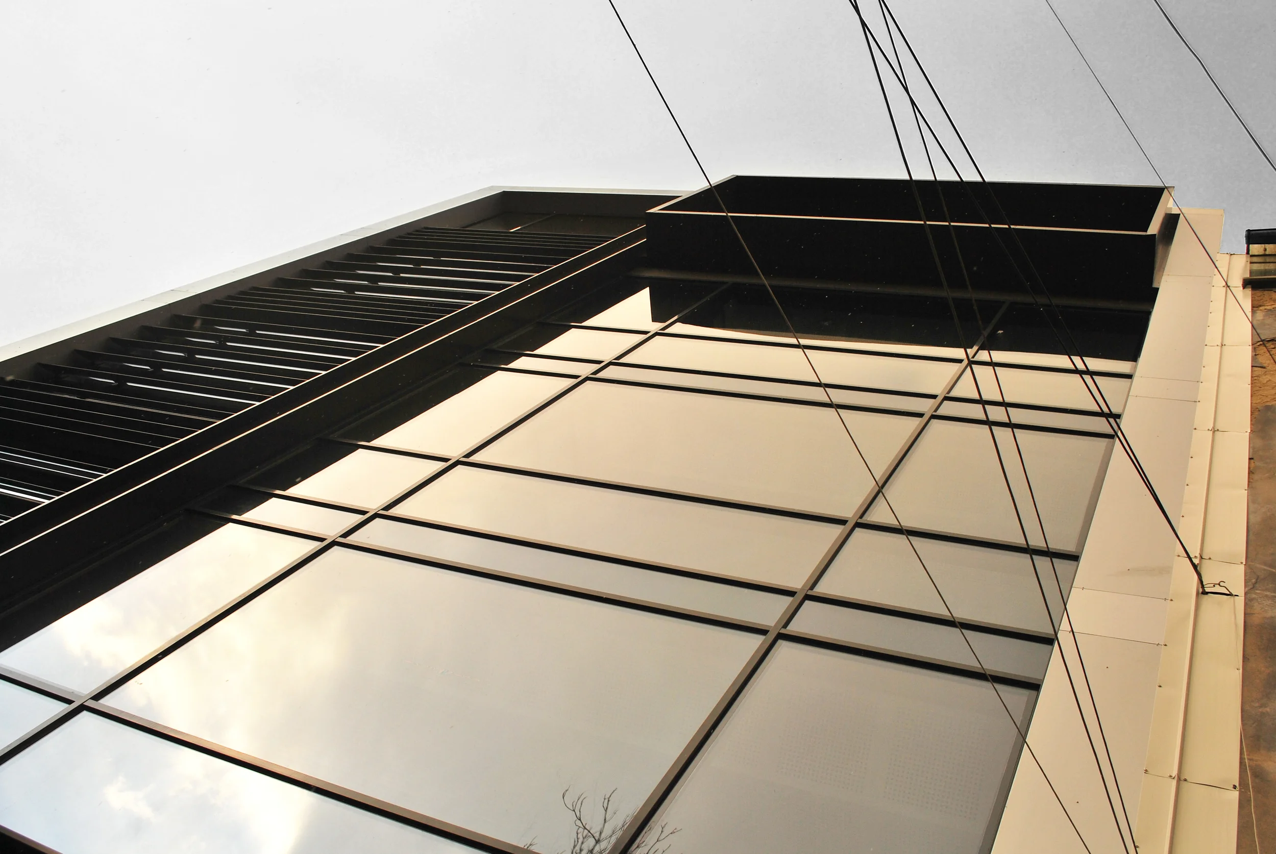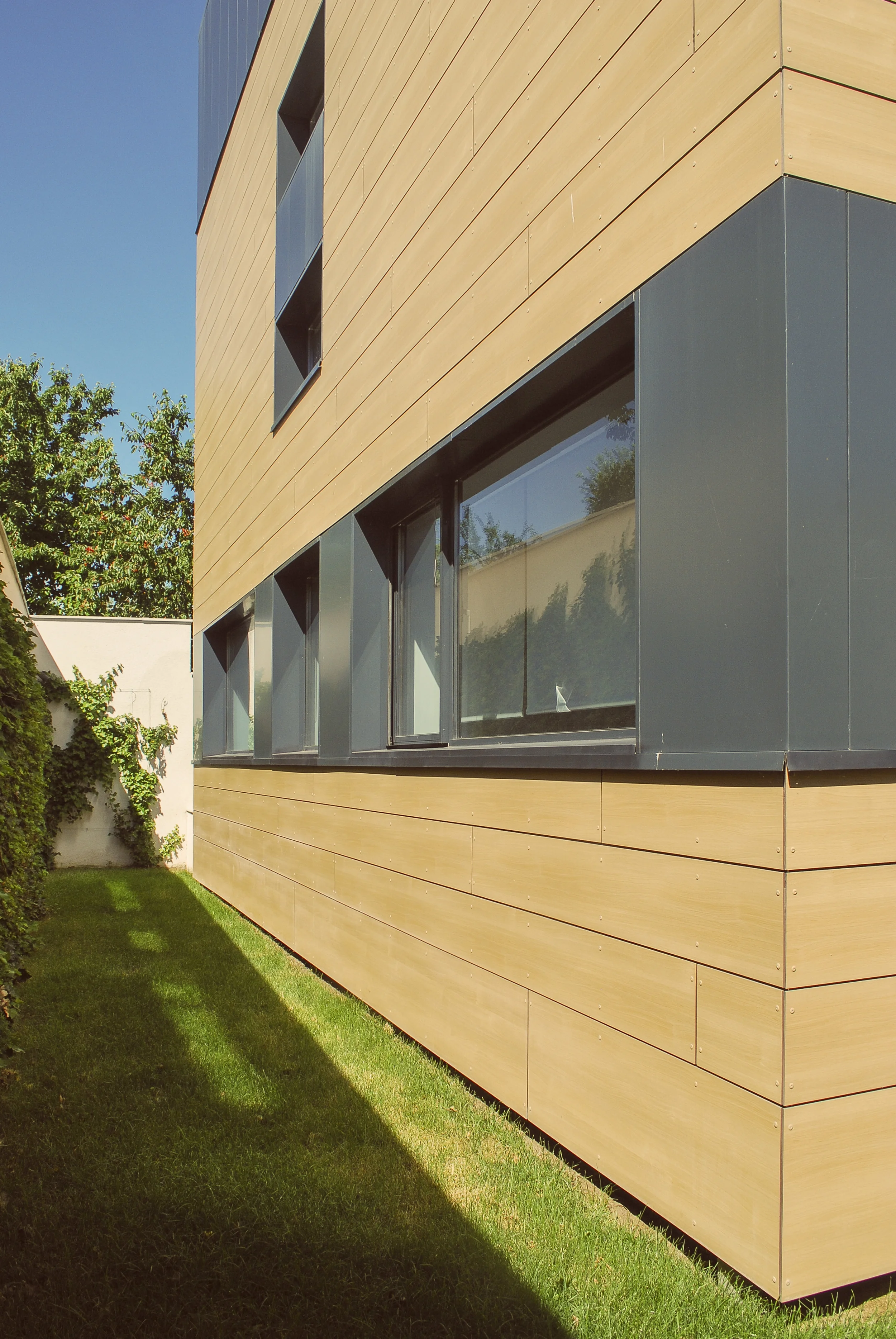 The other short facade, facing the office block is pierced with a grid of very small openings which protect the privacy of the apartment building.