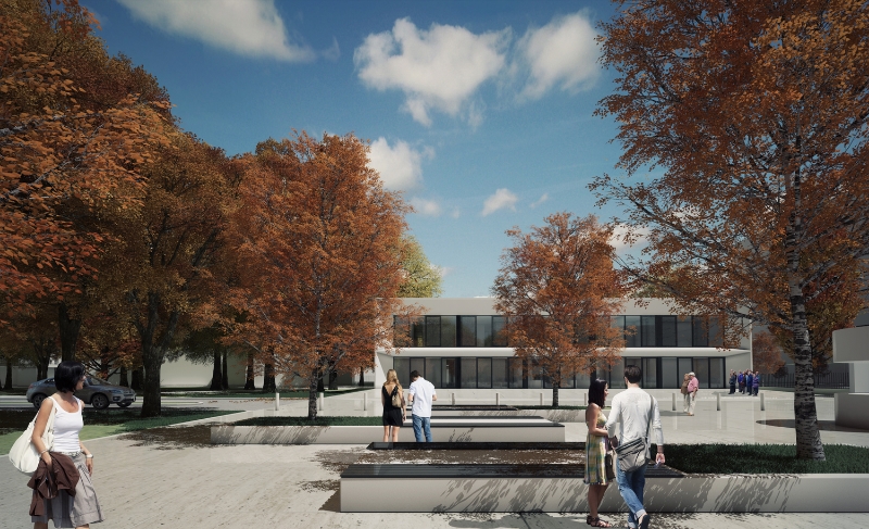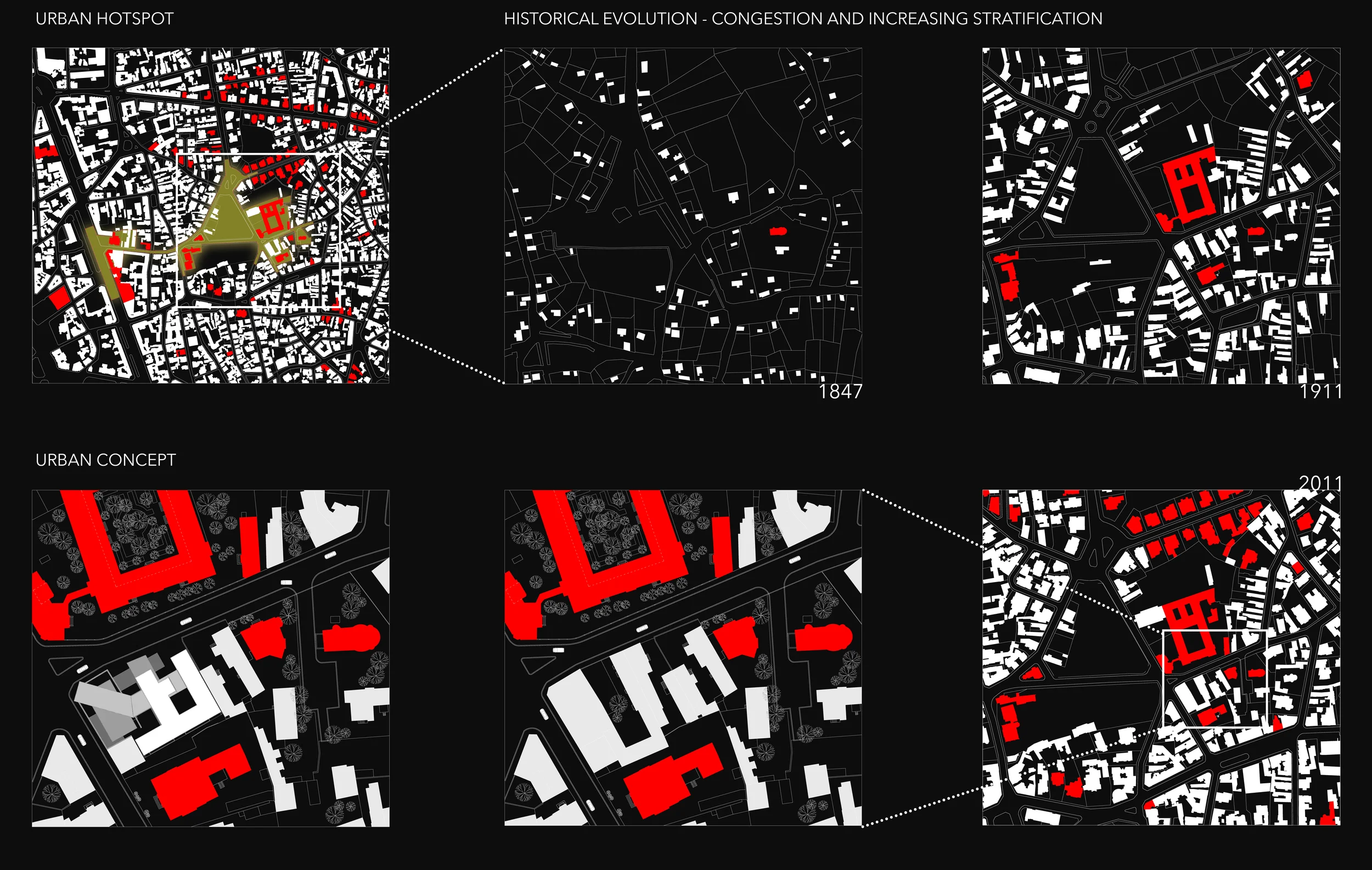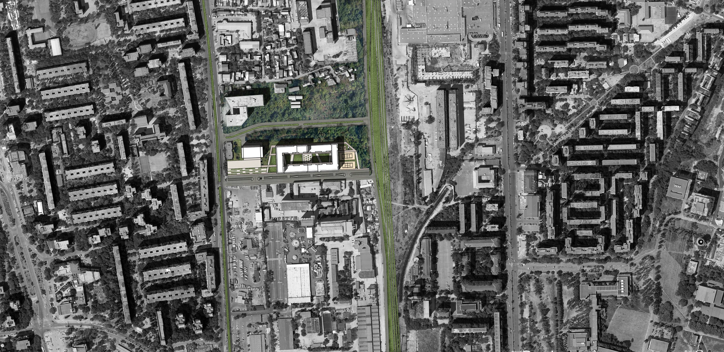 The project site is on the spot of an old textile factory, located on the border between this two urban ecologies - the stark communist development with concrete boulevards and grey facades and the picturesque and soft neighbourhood made of villas and interwar apartment blocks.